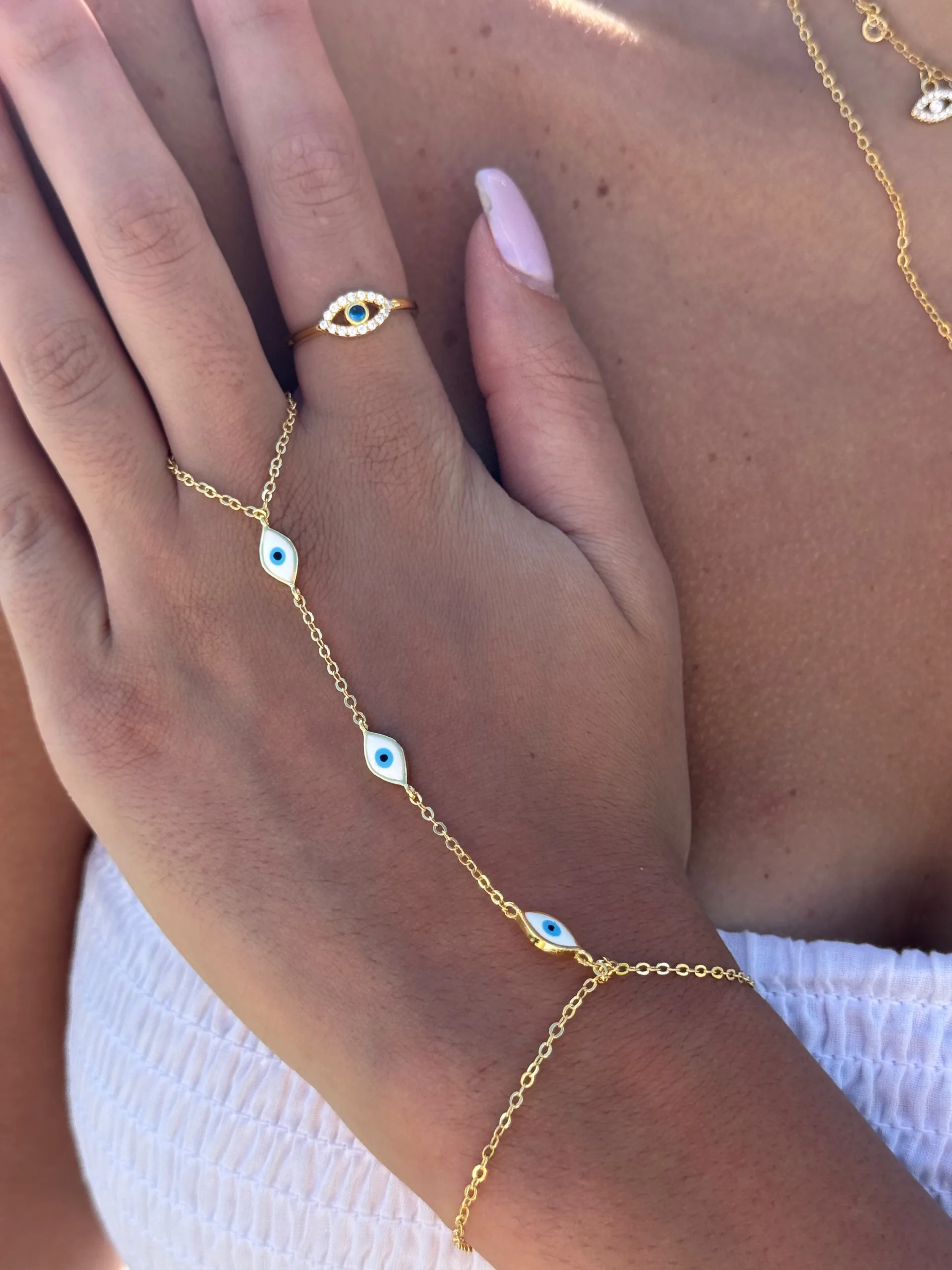 Gold-Plated hand chain stylish and versatile, featuring a shimmering evil eye charms that bring protection and positive energy.