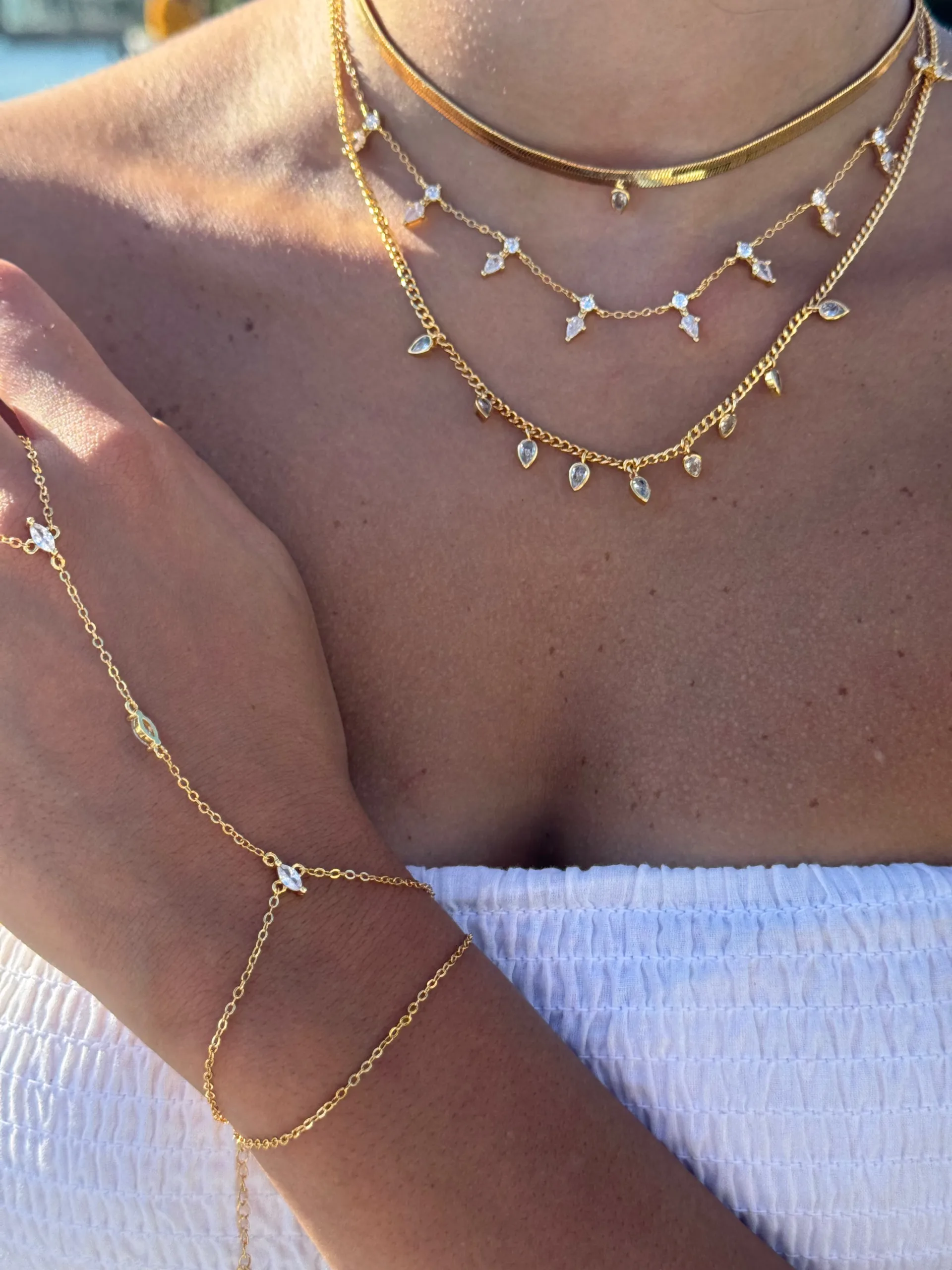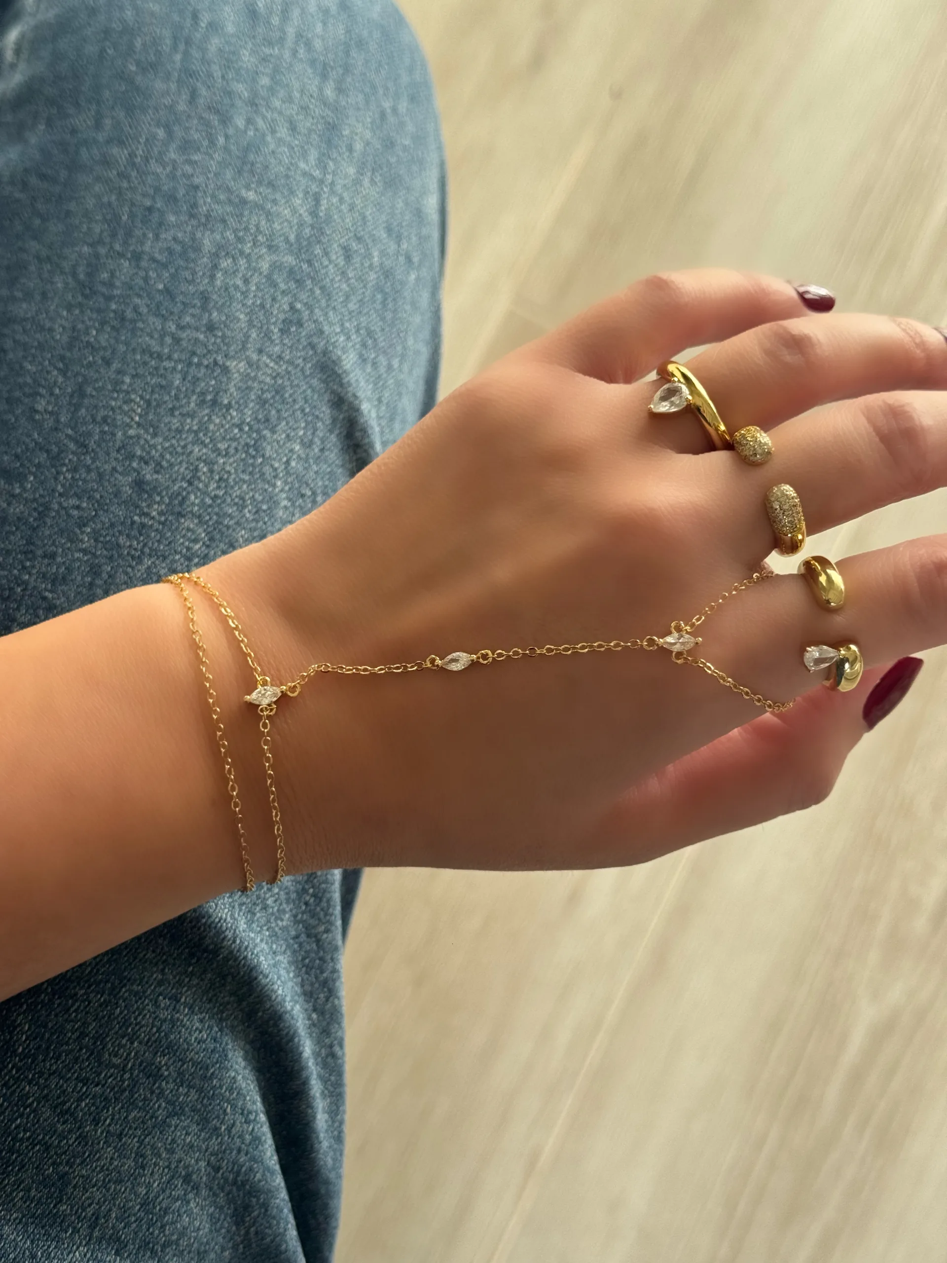 The marquise muse hand chain features finely cut marquise-shaped stones that shimmer with every movement, creating a radiant leaf-like pattern across your hand.