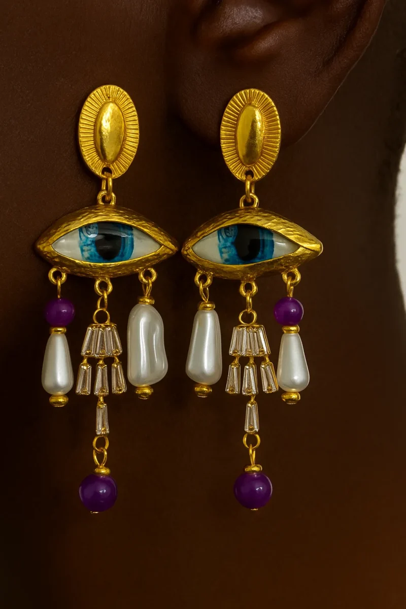 These Statement earrings feature a bold evil eye design, crated to combine style with symbolic protection. Chunky and eye-catching, they bring a powerful charm to any outfit, perfect for adding both meaning and flair.