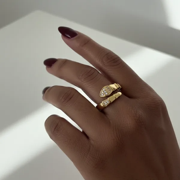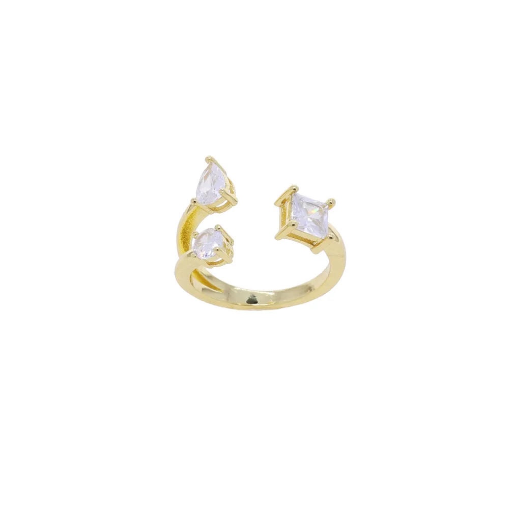 An adjustable ring featuring round, square, and pear-shaped stones for a unique geometric look.